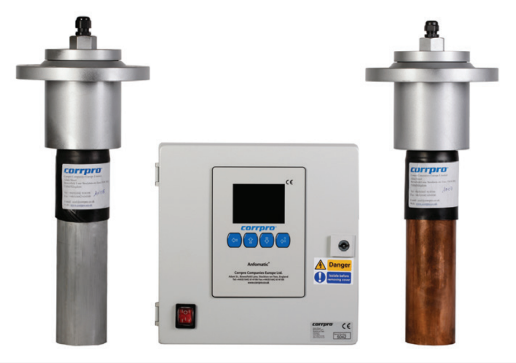 The Anfomatic® system applies direct current to copper anode(s) releasing a controlled quantity of copper ions into the system to create an environment in which primary forms of marine life do not grow. Current applied to the aluminium anode releases a ‘floc’, a precipitate of aluminium hydroxide. The aluminium oxidation products reduce corrosion rates on ferrous components in the seawater system by modifying the ferrous oxides and by film deposition. Similarly, iron anodes are utilized for cupro-nikel pipework. The Anfomatic® system requires minimal maintenance and is environmentally friendly. Mussels are not killed by the systems: the environment it creates prevents them settling or developing. A further benefit on the Anfomatic® system is that potable water distillation of plants can be operated without interruption.